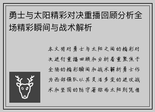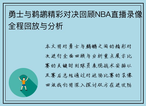 在本篇文章中,我们将对“国王勇士激战”这一精彩比赛进行全面回顾,分析比赛录像中的关键时刻,并分享其中的精彩瞬间。比赛不仅是技战术的较量,更是球员之间心理和身体素质的比拼。我们将从比赛背景、主要亮点、运动员表现以及赛后分析四个方面深入探讨这场赛事,以期为读者呈现一个生动而详实的比赛全景。 1、比赛背景与前瞻 在本次国王与勇士的激战之前,两队都经历了不同程度的起伏。国王队作为东部强队,他们在新赛季中...